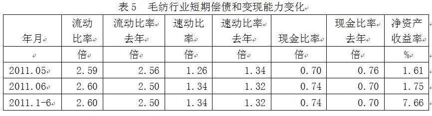 從短期償債和變現(xiàn)能力的變化看,毛紡行業(yè)流動比率(流動資產(chǎn)/流動負(fù)債)2011年1-6月份為2.60倍,而上年同期為2.50倍,流動比率較高,表明企業(yè)短期償債能力較強(qiáng);