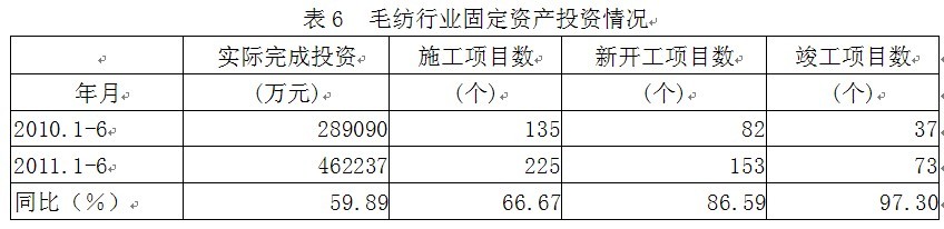 據(jù)國家統(tǒng)計(jì)局公布的數(shù)據(jù),2011年1-6月份毛紡行業(yè)實(shí)際完成投資額46.22億元,同比增加59.89%;當(dāng)年以來到目前為止施工項(xiàng)目總數(shù)為225個,同比增加66.67%;其中新開工項(xiàng)目數(shù)153個,同比增加86.59%;截至6月底為止,已實(shí)現(xiàn)竣工項(xiàng)目數(shù)73個,同比增加97.30%,占施工項(xiàng)目總數(shù)的32.44%,表明該行業(yè)投資項(xiàng)目進(jìn)展較好。