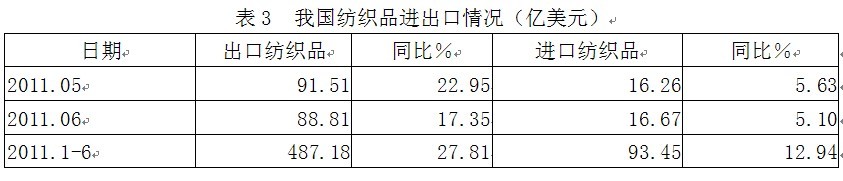 根據(jù)中國海關的統(tǒng)計數(shù)據(jù),我國2011年1-6月份紡織品出口總額487.18億美元,同比增加27.81%,占紡織品及服裝出口總額1145.42億美元的42.53%;1-6月份紡織品進口總額93.45億美元,同比增加12.94%,占紡織品及服裝進口總額110.03億美元的84.92%;顯示中國紡織品外貿(mào)形勢較好。