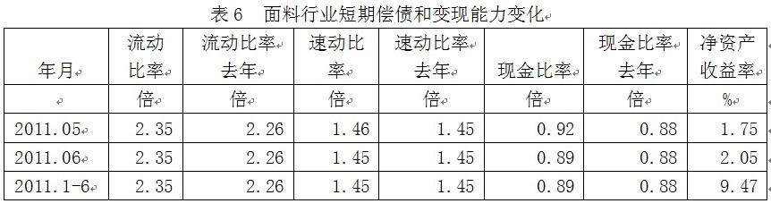 從短期償債和變現(xiàn)能力的變化看,面料行業(yè)流動比率(流動資產(chǎn)/流動負債)2011年1-6月份為2.35倍,而上年同期為2.26倍,流動比率較高,表明企業(yè)短期償債能力較強;