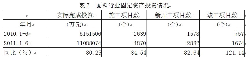 據(jù)國家統(tǒng)計局公布的數(shù)據(jù),2011年1-6月份面料行業(yè)實際完成投資額1108.81億元,同比增加80.25%;當年以來到目前為止施工項目總數(shù)為4870個,同比增加84.54%;其中新開工項目數(shù)2882個,同比增加82.64%;截至6月底為止,已實現(xiàn)竣工項目數(shù)1674個,同比增加121.14%,占施工項目總數(shù)的34.37%,表明該行業(yè)投資項目進展較好。