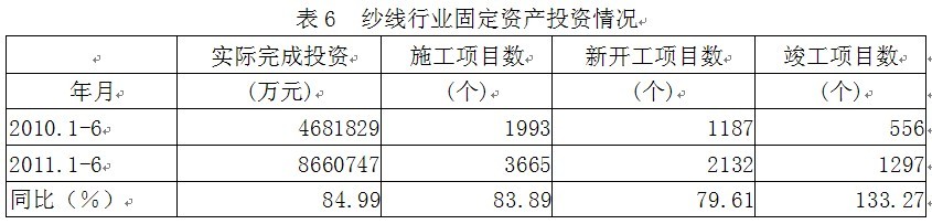 據(jù)國家統(tǒng)計(jì)局公布的數(shù)據(jù),2011年1-6月份紗線行業(yè)實(shí)際完成投資額866.07億元,同比增加84.99%;當(dāng)年以來到目前為止施工項(xiàng)目總數(shù)為3665個(gè),同比增加83.89%;其中新開工項(xiàng)目數(shù)2132個(gè),同比增加79.61%;截至6月底為止,已實(shí)現(xiàn)竣工項(xiàng)目數(shù)1297個(gè),同比增加133.27%,占施工項(xiàng)目總數(shù)的35.39%,表明該行業(yè)投資項(xiàng)目進(jìn)展較好。