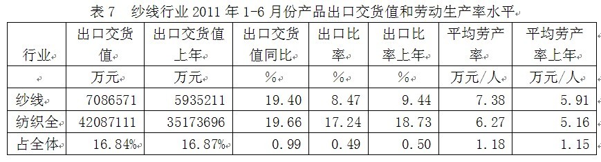 從行業(yè)產(chǎn)品出口交貨值和勞動(dòng)生產(chǎn)率水平看,2011年1-6月份紗線行業(yè)產(chǎn)品出口交貨值為708.66億元,占紡織全行業(yè)的16.84%;出口交貨值比上年同期增加19.40%;該行業(yè)產(chǎn)品出口比率(出口交貨值/工業(yè)銷售產(chǎn)值)為8.47%,而上年同期為9.44%,表明該行業(yè)產(chǎn)品出口狀況較好;從勞動(dòng)生產(chǎn)率的水平看,2011年1-6月份紗線行業(yè)平均勞產(chǎn)率(工業(yè)增加值/從業(yè)人數(shù))為7.38萬元/人,而上年同期為5.91萬元/人,表明該行業(yè)勞動(dòng)生產(chǎn)率的實(shí)際水平較為理想。