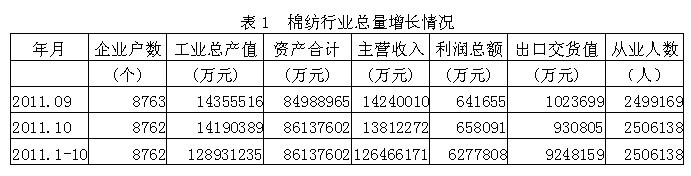 據(jù)國(guó)家統(tǒng)計(jì)局公布的數(shù)據(jù),2011年1-10月份我國(guó)規(guī)模以上棉紡行業(yè)企業(yè)數(shù)量為8762家,該行業(yè)實(shí)現(xiàn)工業(yè)總產(chǎn)值12893億元,同比增加31.55%;資產(chǎn)合計(jì)8614億元,同比增加19.21%;實(shí)現(xiàn)主營(yíng)收入12647億元,同比增加31.47%;完成利潤(rùn)總額627.78億元,比上年同期增加146.71億元,同比增加30.50%;完成出口交貨值924.8億元,同比增加13.68%;行業(yè)整體從業(yè)人數(shù)250.61萬(wàn)人,同比增加6.58%。由此可見,棉紡行業(yè)總量增長(zhǎng)勢(shì)頭良好,并為我國(guó)經(jīng)濟(jì)、財(cái)政、出口和就業(yè)作出了重大的貢獻(xiàn)。