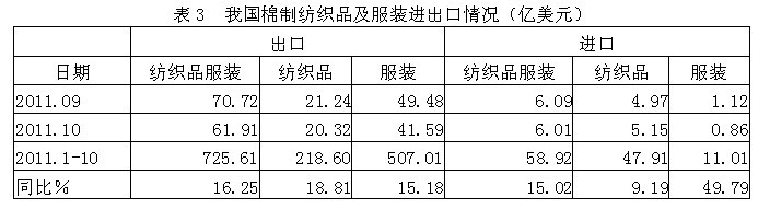在進(jìn)口方面,我國(guó)2011年1-10月份棉制紡織品及服裝進(jìn)口總額58.92億美元,同比增加15.02%,占紡織品及服裝進(jìn)口總額190.45億美元的30.94%;其中1-10月份棉制紡織品進(jìn)口總額47.91億美元,同比增加9.19%,占紡織品進(jìn)口總額157.61億美元的30.40%;1-10月份棉制服裝進(jìn)口總額11.01億美元,同比增加49.79%,占服裝進(jìn)口總額32.84億美元的33.53%;顯示中國(guó)棉制紡織品和服裝外貿(mào)形勢(shì)較好。