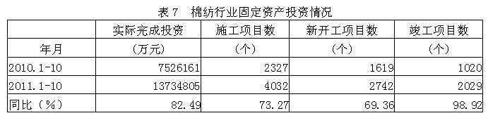 據(jù)國(guó)家統(tǒng)計(jì)局公布的數(shù)據(jù),2011年1-10月份棉紡行業(yè)實(shí)際完成投資額1373.48億元,同比增加82.49%;當(dāng)年以來(lái)到目前為止施工項(xiàng)目總數(shù)為4032個(gè),同比增加73.27%;其中新開工項(xiàng)目數(shù)2742個(gè),同比增加69.36%;截至10月底為止,已實(shí)現(xiàn)竣工項(xiàng)目數(shù)2029個(gè),同比增加98.92%,占施工項(xiàng)目總數(shù)的50.32%,表明該行業(yè)投資項(xiàng)目進(jìn)展較好。