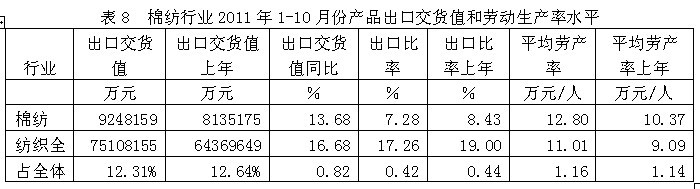從行業(yè)產(chǎn)品出口交貨值和勞動(dòng)生產(chǎn)率水平看,2011年1-10月份棉紡行業(yè)產(chǎn)品出口交貨值為924.82億元,占紡織全行業(yè)的12.31%;出口交貨值比上年同期增加13.68%;該行業(yè)產(chǎn)品出口比率(出口交貨值/工業(yè)銷售產(chǎn)值)為7.28%,而上年同期為8.43%,表明該行業(yè)產(chǎn)品出口狀況較好;從勞動(dòng)生產(chǎn)率的水平看,2011年1-10月份棉紡行業(yè)平均勞產(chǎn)率(工業(yè)增加值/從業(yè)人數(shù))為12.80萬(wàn)元/人,而上年同期為10.37萬(wàn)元/人,表明該行業(yè)勞動(dòng)生產(chǎn)率的實(shí)際水平較為理想。
