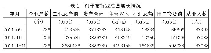 據(jù)國家統(tǒng)計局公布的數(shù)據(jù),2011年1-10月份我國規(guī)模以上簾子布行業(yè)上下游企業(yè)數(shù)量為238家,該行業(yè)實現(xiàn)工業(yè)總產值388.01億元,同比增加23.20%;資產合計382.98億元,同比增加19.75%;實現(xiàn)主營收入419.32億元,同比增加25.85%;完成利潤總額16.48億元,比上年同期增加2.33億元,同比增加16.44%;完成出口交貨值59.2億元,同比增加42.07%;行業(yè)整體從業(yè)人數(shù)6.71萬人,同比增加5.91%。由此可見,簾子布行業(yè)總量增長勢頭良好,并為我國經濟、財政、出口和就業(yè)作出了重大的貢獻。