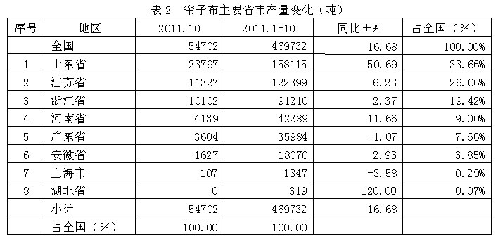 全國簾子布2011年1-10月份產量合計為46.97萬噸,比上年同期增加16.68%;其中產量最大的省市是山東省,產量為15.81萬噸,為省市龍頭;其次是江蘇省,產量12.24萬噸,位居亞軍;然后是浙江省,產量9.12萬噸,榮立第三;河南省4.23萬噸,為第四;廣東省3.60萬噸,占第五;安徽省1.81萬噸,位居第六;接下來是上海市0.13萬噸,為第七;湖北省0.03萬噸,占第八;上述8大省市2011年1-10月份產量合計為46.97萬噸,占全國2011年1-10月份總產量的100.00%。
