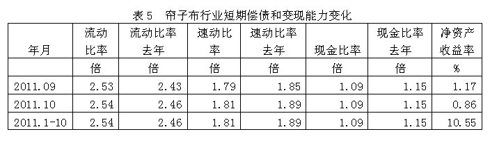 從短期償債和變現(xiàn)能力的變化看,簾子布行業(yè)流動比率(流動資產/流動負債)2011年1-10月份為2.54倍,而上年同期為2.46倍,流動比率較高,表明企業(yè)短期償債能力較強;