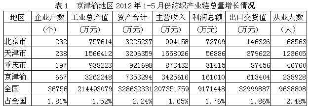 據(jù)國(guó)家統(tǒng)計(jì)局公布的數(shù)據(jù),2012年1-5月份我國(guó)京津渝三大城市(北京市、天津市、重慶市)紡織產(chǎn)業(yè)鏈(從紡織上游原料到下游服裝)規(guī)模以上企業(yè)數(shù)量為667家,占全國(guó)總數(shù)的1.81%;工業(yè)總產(chǎn)值為326.22億元,占1.52%;資產(chǎn)合計(jì)為735.33億元,占2.24%;主營(yíng)收入為342.56億元,占1.65%;利潤(rùn)總額為16.10億元,占1.76%;出口交貨值為61.34億元,占1.86%;從業(yè)人數(shù)為23.89萬(wàn)人,占2.48%。由此可見,京津渝地區(qū)紡織產(chǎn)業(yè)鏈總產(chǎn)值、總資產(chǎn)、主營(yíng)收入、利潤(rùn)總額、出口和就業(yè)均給全國(guó)作出了一定的貢獻(xiàn)。