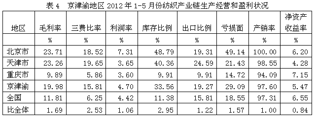 從生產(chǎn)經(jīng)營(yíng)和盈利狀況看,京津渝紡織產(chǎn)業(yè)鏈毛利率2012年1-5月份為19.98%,為全國(guó)平均數(shù)的1.69倍,三費(fèi)比率(營(yíng)業(yè)、管理和財(cái)務(wù)費(fèi)用率之和)為15.81%,為全國(guó)平均數(shù)的2.53倍,利潤(rùn)率為4.70%,為全國(guó)平均數(shù)的1.06倍;庫(kù)存比率為33.56%,為全國(guó)平均數(shù)的2.95倍;出口比例為19.27%,為全國(guó)平均數(shù)的1.22倍;企業(yè)虧損面為29.09%,為全國(guó)平均數(shù)的1.57倍。由此可見,京津渝地區(qū)的盈利狀況接近于全國(guó)紡織產(chǎn)業(yè)鏈的平均水平。