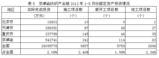 據(jù)國(guó)家統(tǒng)計(jì)局公布的數(shù)據(jù),2012年1-5月份京津渝地區(qū)紡織產(chǎn)業(yè)鏈實(shí)際完成投資額54.27億元,占全國(guó)實(shí)際投資總額的2.08%;當(dāng)年以來到目前為止施工項(xiàng)目總數(shù)為242個(gè),占全國(guó)施工總數(shù)的2.46%;其中新開工項(xiàng)目數(shù)114個(gè),占全國(guó)新開工項(xiàng)目總數(shù)的1.98%;截至5月底為止,已實(shí)現(xiàn)竣工項(xiàng)目數(shù)63個(gè),占全國(guó)已竣工項(xiàng)目總數(shù)的2.34%,占該地區(qū)施工項(xiàng)目總數(shù)的26.03%,表明該地區(qū)投資項(xiàng)目進(jìn)展較好。