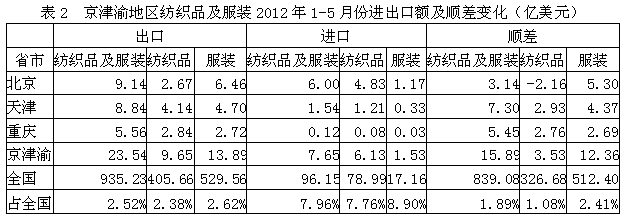 我國(guó)京津渝三地2012年1-5月份紡織品及服裝出口額為23.54億美元,占全國(guó)紡織品服裝出口總額的2.52%,其中紡織品出口額為9.65億美元,占全國(guó)2.38%,服裝出口額為13.89億美元,占全國(guó)2.62%;在進(jìn)口方面,京津渝三地紡織品及服裝進(jìn)口額為7.65億美元,占全國(guó)紡織品服裝進(jìn)口總額的7.96%,其中紡織品進(jìn)口額為6.13億美元,占全國(guó)7.76%,服裝進(jìn)口額為1.53億美元,占全國(guó)8.90%;顯示我國(guó)京津渝地區(qū)紡織品服裝出口總額遠(yuǎn)高于進(jìn)口總額,順差明顯,表明該地區(qū)紡織品服裝在國(guó)際市場(chǎng)上競(jìng)爭(zhēng)力較強(qiáng)。