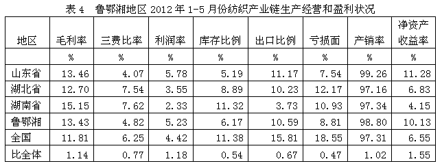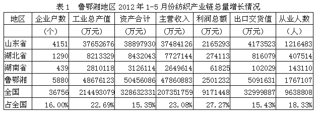 據(jù)國家統(tǒng)計局公布的數(shù)據(jù),2012年1-5月份我國魯鄂湘三省(山東省、湖北省、湖南?。┘徔棶a(chǎn)業(yè)鏈(從紡織上游原料到下游服裝)規(guī)模以上企業(yè)數(shù)量為5880家,占全國總數(shù)的16.00%;工業(yè)總產(chǎn)值為4867.61億元,占22.69%;資產(chǎn)合計為5045.61億元,占15.35%;主營收入為4786.09億元,占23.08%;利潤總額為250.12億元,占27.27%;出口交貨值為509.16億元,占15.43%;從業(yè)人數(shù)為176.71萬人,占18.33%。由此可見,魯鄂湘地區(qū)紡織產(chǎn)業(yè)鏈總產(chǎn)值、總資產(chǎn)、主營收入、利潤總額、出口和就業(yè)均給全國作出了巨大的貢獻。