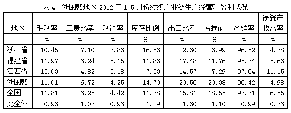 從生產(chǎn)經(jīng)營和盈利狀況看,浙閩贛紡織產(chǎn)業(yè)鏈毛利率2012年1-5月份為11.01%,為全國平均數(shù)的0.93倍,三費比率(營業(yè)、管理和財務(wù)費用率之和)為6.72%,為全國平均數(shù)的1.07倍,利潤率為4.25%,為全國平均數(shù)的0.96倍;庫存比率為14.70%,為全國平均數(shù)的1.29倍;出口比例為20.56%,為全國平均數(shù)的1.30倍;企業(yè)虧損面為20.38%,為全國平均數(shù)的1.10倍。由此可見,浙閩贛地區(qū)的盈利狀況接近于全國紡織產(chǎn)業(yè)鏈的平均水平。