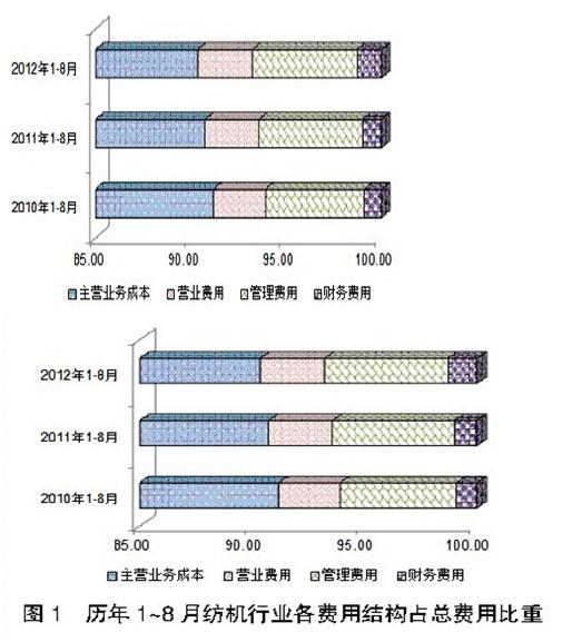 據(jù)國家統(tǒng)計局數(shù)據(jù)顯示,2012年前三季度紡織機械行業(yè)經(jīng)濟規(guī)模、產(chǎn)銷、成本費用均出現(xiàn)了增長,全行業(yè)實現(xiàn)利潤總額稍有下降,企業(yè)虧損面略有增加。前三季度數(shù)據(jù)表明,2012年1~8月紡機行業(yè)實現(xiàn)主營業(yè)務(wù)收入698.59億元,同比增長5.35%;資產(chǎn)總計為844.87億元,同比增長5.60%。1~8月,紡機行業(yè)工業(yè)銷售產(chǎn)值為693.91億元,同比增長7.09%;產(chǎn)銷率為97.74%,同比增長0.49百分點;產(chǎn)成品占用資金為45.55億元,同比增長18.11%。 1~8月,紡機行業(yè)成本費用總額為656.33億元,同比增長6.58%。其中,主營業(yè)務(wù)成本為592.98億元,同比增長6.10%,占成本費用總額的比重為90.35%,同比下降0.40個百分點;營業(yè)費用為18.92億元,同比增長9.47%,占成本費用總額的比重為2.88%,同比增長0.08個百分點(見圖1)。
