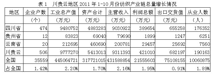 據(jù)國家統(tǒng)計(jì)局公布的數(shù)據(jù),2011年1-10月份我國川貴云三?。ㄋ拇ㄊ ①F州省、云南省)紡織產(chǎn)業(yè)鏈(從紡織上游原料到下游服裝)規(guī)模以上企業(yè)數(shù)量為506家,占全國總數(shù)的1.42%;工業(yè)總產(chǎn)值為977.73億元,占2.20%;資產(chǎn)合計(jì)為541.30億元,占1.70%;主營收入為931.14億元,占2.16%;利潤總額為42.10億元,占1.95%;出口交貨值為68.22億元,占0.91%;從業(yè)人數(shù)為19.02萬人,占1.89%。由此可見,川貴云地區(qū)紡織產(chǎn)業(yè)鏈總產(chǎn)值、總資產(chǎn)、主營收入、利潤總額、出口和就業(yè)均給全國作出了一定的貢獻(xiàn)。