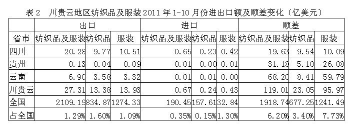 我國川貴云三省2011年1-10月份紡織品及服裝出口額為27.31億美元,占全國紡織品服裝出口總額的1.29%,其中紡織品出口額為13.38億美元,占全國1.60%,服裝出口額為13.93億美元,占全國1.09%;在進(jìn)口方面,川貴云三省紡織品及服裝進(jìn)口額為0.67億美元,占全國紡織品服裝進(jìn)口總額的0.35%,其中紡織品進(jìn)口額為0.24億美元,占全國0.15%,服裝進(jìn)口額為0.43億美元,占全國1.30%;顯示我國川貴云地區(qū)紡織品服裝出口總額遠(yuǎn)高于進(jìn)口總額,順差明顯,表明該地區(qū)紡織品服裝在國際市場上競爭力較強(qiáng)。