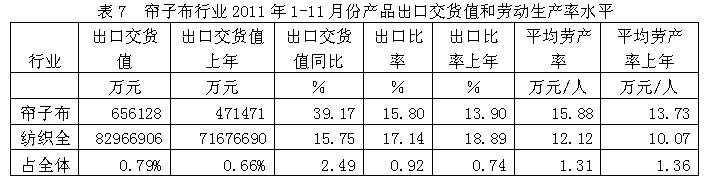 從行業(yè)產(chǎn)品出口交貨值和勞動(dòng)生產(chǎn)率水平看,2011年1-11月份簾子布行業(yè)產(chǎn)品出口交貨值為65.61億元,占紡織全行業(yè)的0.79%;出口交貨值比上年同期增加39.17%;該行業(yè)產(chǎn)品出口比率(出口交貨值/工業(yè)銷售產(chǎn)值)為15.80%,而上年同期為13.90%,表明該行業(yè)產(chǎn)品出口狀況較好;從勞動(dòng)生產(chǎn)率的水平看,2011年1-11月份簾子布行業(yè)平均勞產(chǎn)率(工業(yè)增加值/從業(yè)人數(shù))為15.88萬(wàn)元/人,而上年同期為13.73萬(wàn)元/人,表明該行業(yè)勞動(dòng)生產(chǎn)率的實(shí)際水平比較理想。