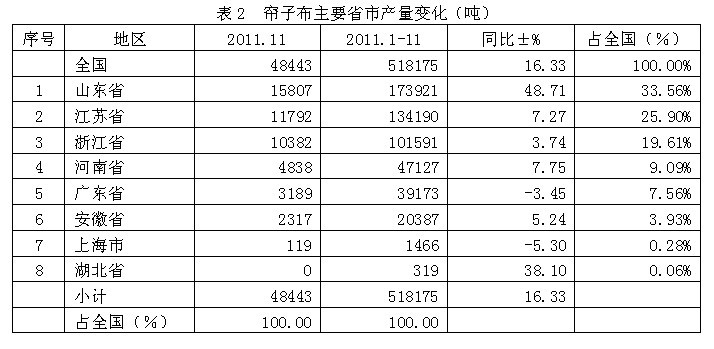 全國(guó)簾子布2011年1-11月份產(chǎn)量合計(jì)為51.82萬(wàn)噸,比上年同期增加16.33%;其中產(chǎn)量最大的省市是山東省,產(chǎn)量為17.39萬(wàn)噸,為省市龍頭;其次是江蘇省,產(chǎn)量13.42萬(wàn)噸,位居亞軍;然后是浙江省,產(chǎn)量10.16萬(wàn)噸,榮立第三;河南省4.71萬(wàn)噸,為第四;廣東省3.92萬(wàn)噸,占第五;安徽省2.04萬(wàn)噸,位居第六;接下來(lái)是上海市0.15萬(wàn)噸,為第七;湖北省0.03萬(wàn)噸,占第八;上述8大省市2011年1-11月份產(chǎn)量合計(jì)為51.82萬(wàn)噸,占全國(guó)2011年1-11月份總產(chǎn)量的100.00%。
