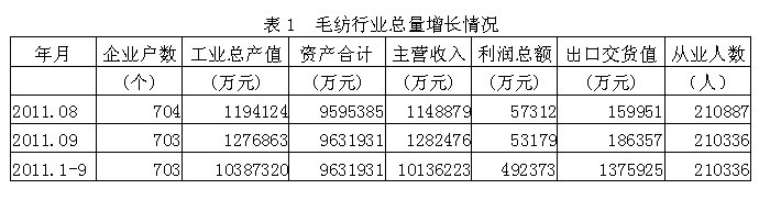 據(jù)國(guó)家統(tǒng)計(jì)局公布的數(shù)據(jù),2011年1-9月份我國(guó)規(guī)模以上毛紡行業(yè)企業(yè)數(shù)量為703家,該行業(yè)實(shí)現(xiàn)工業(yè)總產(chǎn)值1038.73億元,同比增加26.45%;資產(chǎn)合計(jì)963.19億元,同比增加14.82%;實(shí)現(xiàn)主營(yíng)收入1013.62億元,同比增加26.72%;完成利潤(rùn)總額49.24億元,比上年同期增加9.47億元,同比增加23.82%;完成出口交貨值137.6億元,同比增加16.22%;行業(yè)整體從業(yè)人數(shù)21.03萬人,同比增加6.92%。由此可見,毛紡行業(yè)總量增長(zhǎng)勢(shì)頭良好,并為我國(guó)經(jīng)濟(jì)、財(cái)政、出口和就業(yè)作出了重大的貢獻(xiàn)。