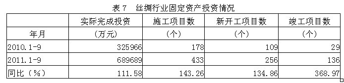 據(jù)國(guó)家統(tǒng)計(jì)局公布的數(shù)據(jù),2011年1-9月份絲綢行業(yè)實(shí)際完成投資額68.97億元,同比增加111.58%;當(dāng)年以來(lái)到目前為止施工項(xiàng)目總數(shù)為433個(gè),同比增加143.26%;其中新開(kāi)工項(xiàng)目數(shù)256個(gè),同比增加134.86%;截至9月底為止,已實(shí)現(xiàn)竣工項(xiàng)目數(shù)136個(gè),同比增加368.97%,占施工項(xiàng)目總數(shù)的31.41%,表明該行業(yè)投資項(xiàng)目進(jìn)展較好。