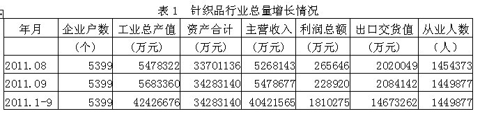 據(jù)國家統(tǒng)計局公布的數(shù)據(jù),2011年1-9月份我國規(guī)模以上針織品行業(yè)企業(yè)數(shù)量為5399家,該行業(yè)實現(xiàn)工業(yè)總產(chǎn)值4242.67億元,同比增加23.08%;資產(chǎn)合計3428.3億元,同比增加15.23%;實現(xiàn)主營收入4042.16億元,同比增加23.27%;完成利潤總額181.03億元,比上年同期增加32.88億元,同比增加22.20%;完成出口交貨值1467.3億元,同比增加14.19%;行業(yè)整體從業(yè)人數(shù)144.99萬人,同比增加2.91%。由此可見,針織品行業(yè)總量增長勢頭良好,并為我國經(jīng)濟、財政、出口和就業(yè)作出了重大的貢獻。