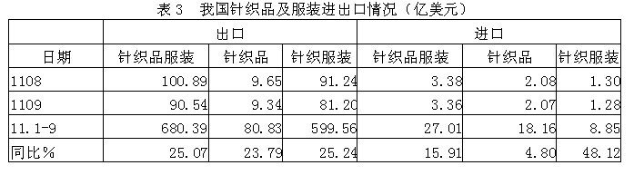 在進口方面,我國2011年1-9月份針織品及服裝進口總額27.01億美元,同比增加15.91%,占紡織品及服裝進口總額171.53億美元的15.75%;其中1-9月份針織品進口總額18.16億美元,同比增加4.80%,占紡織品進口總額142.13億美元的12.78%;1-9月份針織服裝進口總額8.85億美元,同比增加48.12%,占服裝進口總額29.39億美元的30.11%;顯示中國針織品和服裝外貿(mào)形勢較好。