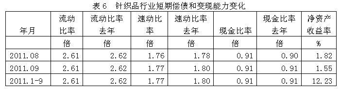 從短期償債和變現(xiàn)能力的變化看,針織品行業(yè)流動比率(流動資產(chǎn)/流動負(fù)債)2011年1-9月份為2.61倍,而上年同期為2.62倍,流動比率較高,表明企業(yè)短期償債能力較強;