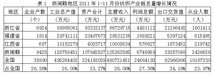 據(jù)國家統(tǒng)計(jì)局公布的數(shù)據(jù),2011年1-11月份我國浙閩贛三省(浙江省、福建省、江西省)紡織產(chǎn)業(yè)鏈(從紡織上游原料到下游服裝)規(guī)模以上企業(yè)數(shù)量為9425家,占全國總數(shù)的26.26%;工業(yè)總產(chǎn)值為12875.85億元,占26.00%;資產(chǎn)合計(jì)為10784.55億元,占33.27%;主營收入為12526.36億元,占26.06%;利潤總額為674.70億元,占27.36%;出口交貨值為2835.71億元,占34.18%;從業(yè)人數(shù)為243.66萬人,占23.97%。由此可見,浙閩贛地區(qū)紡織產(chǎn)業(yè)鏈總產(chǎn)值、總資產(chǎn)、主營收入、利潤總額、出口和就業(yè)均給全國作出了巨大的貢獻(xiàn)。