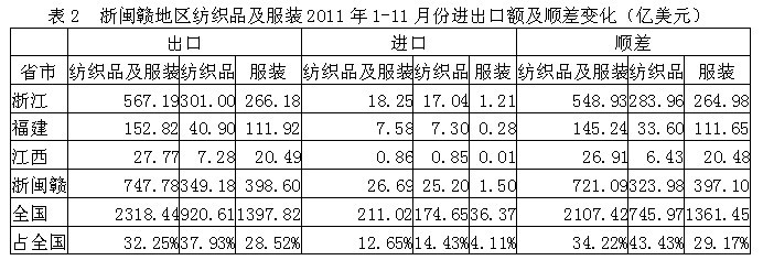我國浙閩贛三省2011年1-11月份紡織品及服裝出口額為747.78億美元,占全國紡織品服裝出口總額的32.25%,其中紡織品出口額為349.18億美元,占全國37.93%,服裝出口額為398.60億美元,占全國28.52%;在進(jìn)口方面,浙閩贛三省紡織品及服裝進(jìn)口額為26.69億美元,占全國紡織品服裝進(jìn)口總額的12.65%,其中紡織品進(jìn)口額為25.20億美元,占全國14.43%,服裝進(jìn)口額為1.50億美元,占全國4.11%;顯示我國浙閩贛地區(qū)紡織品服裝出口總額遠(yuǎn)高于進(jìn)口總額,順差明顯,表明該地區(qū)紡織品服裝在國際市場上競爭力較強(qiáng)。