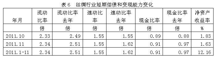 從短期償債和變現能力的變化看,絲綢行業(yè)流動比率(流動資產/流動負債)2011年1-11月份為2.34倍,而上年同期為2.51倍,流動比率較高,表明企業(yè)短期償債能力較強;