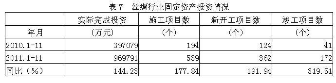 據國家統(tǒng)計局公布的數據,2011年1-11月份絲綢行業(yè)實際完成投資額96.98億元,同比增加144.23%;當年以來到目前為止施工項目總數為539個,同比增加177.84%;其中新開工項目數362個,同比增加191.94%;截至11月底為止,已實現竣工項目數172個,同比增加319.51%,占施工項目總數的31.91%,表明該行業(yè)投資項目進展較好。