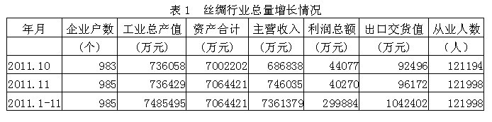 據國家統(tǒng)計局公布的數據,2011年1-11月份我國規(guī)模以上絲綢行業(yè)企業(yè)數量為985家,該行業(yè)實現工業(yè)總產值748.55億元,同比增加25.72%;資產合計706.44億元,同比增加22.27%;實現主營收入736.14億元,同比增加23.04%;完成利潤總額29.99億元,比上年同期增加6.33億元,同比增加26.76%;完成出口交貨值104.2億元,同比增加20.91%;行業(yè)整體從業(yè)人數12.20萬人,同比增加4.25%。由此可見,絲綢行業(yè)總量增長勢頭良好,并為我國經濟、財政、出口和就業(yè)作出了重大的貢獻。