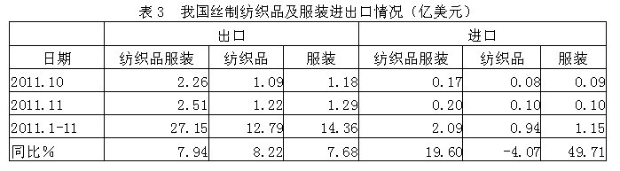 在進口方面,我國2011年1-11月份絲制紡織品及服裝進口總額2.09億美元,同比增加19.60%,占紡織品及服裝進口總額211.02億美元的0.99%;其中1-11月份絲制紡織品進口總額0.94億美元,同比減少4.07%,占紡織品進口總額174.65億美元的0.54%;1-11月份絲制服裝進口總額1.15億美元,同比增加49.71%,占服裝進口總額36.37億美元的3.16%;顯示中國絲制紡織品和服裝外貿形勢較好。