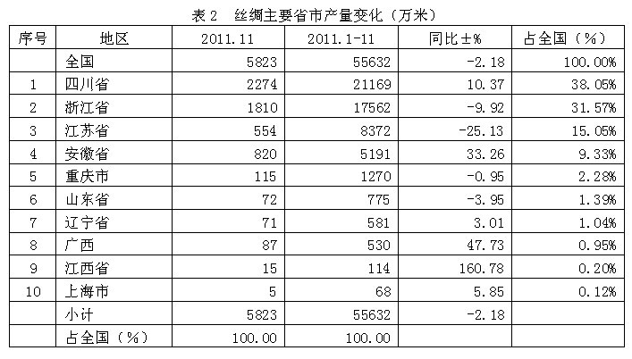 全國絲綢2011年1-11月份產量合計為5.56億米,比上年同期減少2.18%;其中產量最大的省市是四川省,產量為2.12億米,為省市龍頭;其次是浙江省,產量1.76億米,位居亞軍;然后是江蘇省,產量0.84億米,榮立第三;安徽省0.52億米,為第四;重慶市0.13億米,占第五;山東省0.08億米,位居第六;接下來是遼寧省0.06億米,為第七;廣西0.05億米,占第八;江西省0.01億米,位居第九;上海市0.01億米,為第十名;上述10大省市2011年1-11月份產量合計為5.56億米,占全國2011年1-11月份總產量的100.00%。
