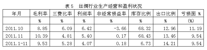 從企業(yè)生產經營和盈利狀況看,絲綢行業(yè)毛利率2011年1-11月份為9.53%,三費比率(營業(yè)、管理和財務費用率之和)為5.28%,利潤率為4.07%,如果剔除非經常性損益的影響,名義稅前利潤率為4.25%;該行業(yè)庫存比率為6.73%,表明產品銷售正常;出口比例為14.21%,表明出口狀況較好;該行業(yè)虧損面為9.54%。由此可見,在絲綢行業(yè)中,生產經營狀況運作得較好。