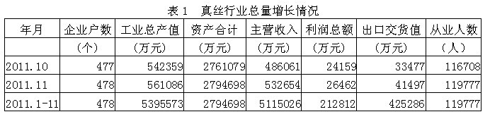 據國家統(tǒng)計局公布的數據,2011年1-11月份我國規(guī)模以上真絲行業(yè)企業(yè)數量為478家,該行業(yè)實現工業(yè)總產值539.56億元,同比增加29.13%;資產合計279.47億元,同比增加15.81%;實現主營收入511.50億元,同比增加27.24%;完成利潤總額21.28億元,比上年同期增加5.93億元,同比增加38.65%;完成出口交貨值42.5億元,同比增加14.61%;行業(yè)整體從業(yè)人數11.98萬人,同比增加7.11%。由此可見,真絲行業(yè)總量增長勢頭良好,并為我國經濟、財政、出口和就業(yè)作出了重大的貢獻。