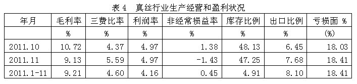 從企業(yè)生產經營和盈利狀況看,真絲行業(yè)毛利率2011年1-11月份為9.21%,三費比率(營業(yè)、管理和財務費用率之和)為4.60%,利潤率為4.16%,如果剔除非經常性損益的影響,名義稅前利潤率為4.61%;該行業(yè)庫存比率為4.91%,表明產品銷售正常;出口比例為8.10%,表明出口狀況較好;該行業(yè)虧損面為18.41%。由此可見,在真絲行業(yè)中,生產經營狀況運作得較好。