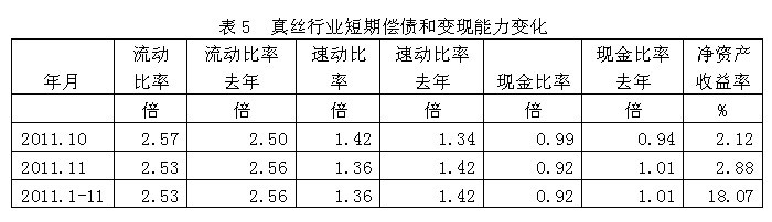 從短期償債和變現能力的變化看,真絲行業(yè)流動比率(流動資產/流動負債)2011年1-11月份為2.53倍,而上年同期為2.56倍,流動比率較高,表明企業(yè)短期償債能力較強;