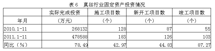 據國家統(tǒng)計局公布的數據,2011年1-11月份真絲行業(yè)實際完成投資額47.86億元,同比增加78.49%;當年以來到目前為止施工項目總數為183個,同比增加42.97%;其中新開工項目數126個,同比增加44.83%;截至11月底為止,已實現竣工項目數103個,同比增加87.27%,占施工項目總數的56.28%,表明該行業(yè)投資項目進展較好。