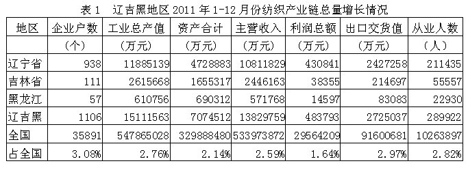 據(jù)國家統(tǒng)計局公布的數(shù)據(jù),2011年1-12月份我國遼吉黑三省(遼寧省、吉林省、黑龍江)紡織產(chǎn)業(yè)鏈(從紡織上游原料到下游服裝)規(guī)模以上企業(yè)數(shù)量為1106家,占全國總數(shù)的3.08%;工業(yè)總產(chǎn)值為1511.16億元,占2.76%;資產(chǎn)合計為707.45億元,占2.14%;主營收入為1382.98億元,占2.59%;利潤總額為48.38億元,占1.64%;出口交貨值為272.50億元,占2.97%;從業(yè)人數(shù)為28.99萬人,占2.82%。由此可見,遼吉黑地區(qū)紡織產(chǎn)業(yè)鏈總產(chǎn)值、總資產(chǎn)、主營收入、出口和就業(yè)均給全國作出了一定的貢獻。