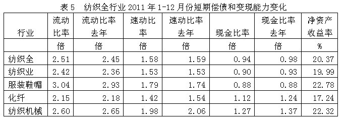 從短期償債和變現(xiàn)能力的變化看,紡織全行業(yè)流動比率(流動資產(chǎn)/流動負債)2011年1-12月份為2.51倍,而上年同期為2.45倍,流動比率較高,表明企業(yè)短期償債能力較強;