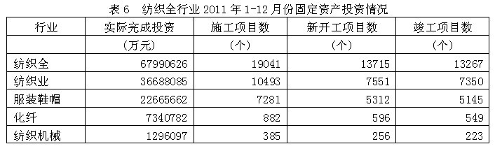 據(jù)國家統(tǒng)計局公布的數(shù)據(jù),2011年1-12月份紡織全行業(yè)實際完成投資額6799.06億元,同比增加68.43%;當年以來到目前為止施工項目總數(shù)為19041個,同比增加64.84%;其中新開工項目數(shù)13715個,同比增加64.41%;截至12月底為止,已實現(xiàn)竣工項目數(shù)13267個,同比增加86.99%,占施工項目總數(shù)的69.68%,表明該行業(yè)投資項目進展較好。