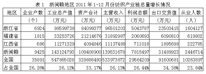 據(jù)國(guó)家統(tǒng)計(jì)局公布的數(shù)據(jù),2011年1-12月份我國(guó)浙閩贛三?。ㄕ憬?、福建省、江西?。┘徔棶a(chǎn)業(yè)鏈(從紡織上游原料到下游服裝)規(guī)模以上企業(yè)數(shù)量為9425家,占全國(guó)總數(shù)的26.26%;工業(yè)總產(chǎn)值為14312.48億元,占26.12%;資產(chǎn)合計(jì)為10940.89億元,占33.17%;主營(yíng)收入為13953.17億元,占26.13%;利潤(rùn)總額為781.55億元,占26.44%;出口交貨值為3148.99億元,占34.38%;從業(yè)人數(shù)為244.67萬(wàn)人,占23.84%。由此可見(jiàn),浙閩贛地區(qū)紡織產(chǎn)業(yè)鏈總產(chǎn)值、總資產(chǎn)、主營(yíng)收入、利潤(rùn)總額、出口和就業(yè)均給全國(guó)作出了巨大的貢獻(xiàn)。
