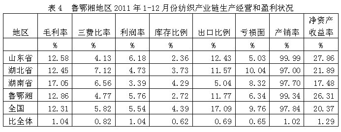 從生產(chǎn)經(jīng)營(yíng)和盈利狀況看,魯鄂湘紡織產(chǎn)業(yè)鏈毛利率2011年1-12月份為12.86%,為全國(guó)平均數(shù)的1.04倍,三費(fèi)比率(營(yíng)業(yè)、管理和財(cái)務(wù)費(fèi)用率之和)為4.77%,為全國(guó)平均數(shù)的0.82倍,利潤(rùn)率為5.76%,為全國(guó)平均數(shù)的1.04倍;庫(kù)存比率為2.72%,為全國(guó)平均數(shù)的0.62倍;出口比例為11.77%,為全國(guó)平均數(shù)的0.69倍;企業(yè)虧損面為6.34%,為全國(guó)平均數(shù)的0.65倍。由此可見,魯鄂湘地區(qū)的盈利狀況接近于全國(guó)紡織產(chǎn)業(yè)鏈的平均水平。