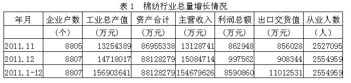 2011年1-12月棉紡行業(yè)經(jīng)濟(jì)運(yùn)行分析