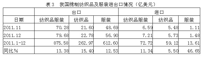 在進(jìn)口方面,我國(guó)2011年1-12月份棉制紡織品及服裝進(jìn)口總額72.72億美元,同比增加11.34%,占紡織品及服裝進(jìn)口總額231.57億美元的31.40%;其中1-12月份棉制紡織品進(jìn)口總額59.12億美元,同比增加5.50%,占紡織品進(jìn)口總額191.47億美元的30.87%;1-12月份棉制服裝進(jìn)口總額13.61億美元,同比增加46.65%,占服裝進(jìn)口總額40.10億美元的33.93%;顯示中國(guó)棉制紡織品和服裝外貿(mào)形勢(shì)較好。