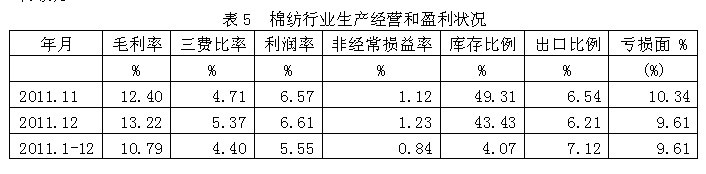 從企業(yè)生產(chǎn)經(jīng)營(yíng)和盈利狀況看,棉紡行業(yè)毛利率2011年1-12月份為10.79%,三費(fèi)比率(營(yíng)業(yè)、管理和財(cái)務(wù)費(fèi)用率之和)為4.40%,利潤(rùn)率為5.55%,如果剔除非經(jīng)常性損益的影響,名義稅前利潤(rùn)率為6.39%;該行業(yè)庫(kù)存比率為4.07%,表明產(chǎn)品銷售正常;出口比例為7.12%,表明出口狀況較好;該行業(yè)虧損面為9.61%。由此可見,在棉紡行業(yè)中,生產(chǎn)經(jīng)營(yíng)狀況運(yùn)作得較好。